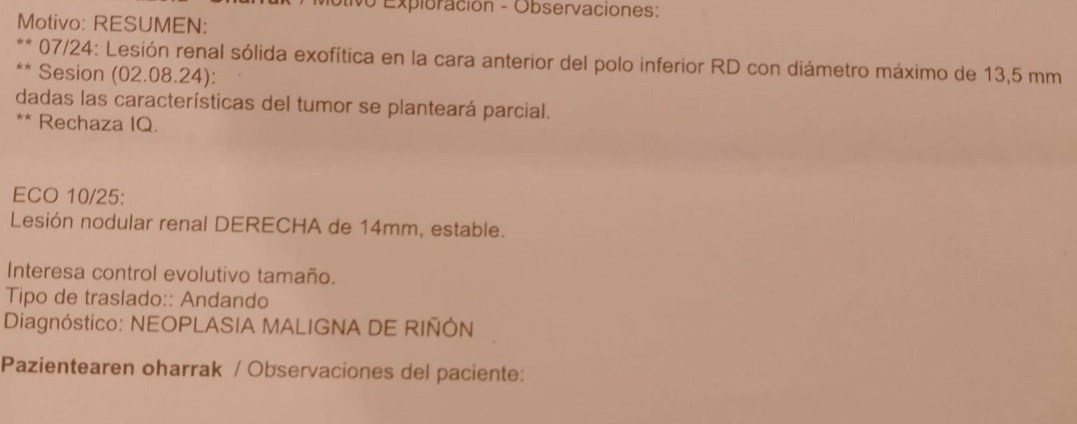 In April 2024, doctors make a fortuitous discovery of a 14mm nodular lesion in his right kidney. The doctors' diagnosis is Malignant Neoplasia of the Kidney.